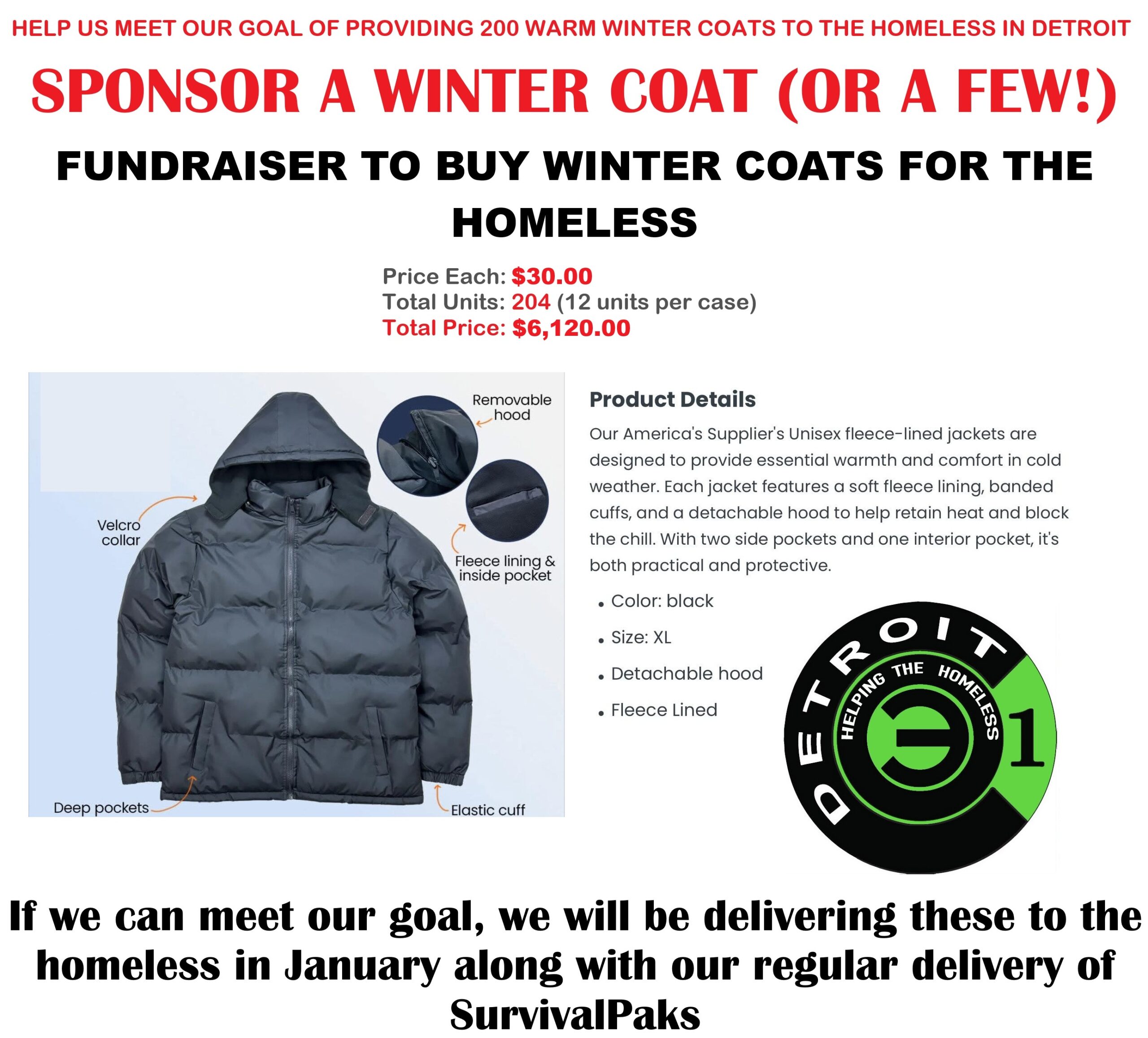 This $75 donation will provide one SurvivalPak to a person in need on the streets of Detroit. The COE1 delivery team will directly hand deliver this SurvivalPak to an unhomed Detroiter during our next delivery run.