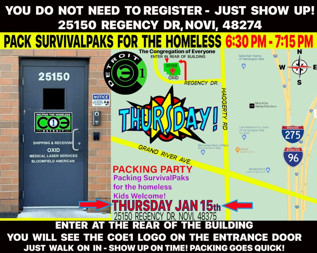 Since 2013 the COE has been providing 200 SurvivalPaks to the homeless on the streets of metro-Detroit every single month. We pack school-style backpacks with basic supplies needed to live on the streets; warm socks, winter hats, ski gloves, scarves, compact blankets, underwear, along with hand warmers, toiletries, toilet paper, lip balm and lots of non perishable food items.